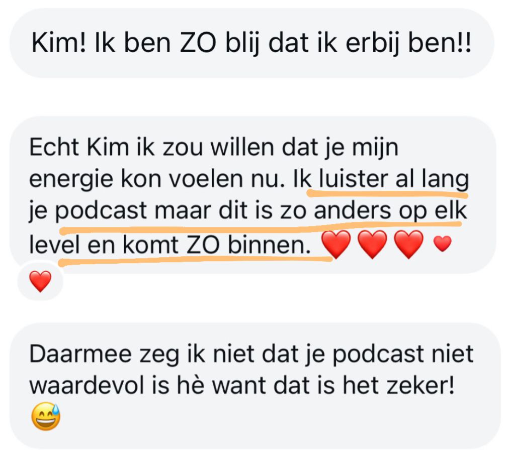 “Deze training is uniek door de praktische en nuchtere benadering! Kim zorgt ervoor dat je het ook écht gaat voelen en volledig in die ontvangmodus komt!” aldus vorige deelnemers!